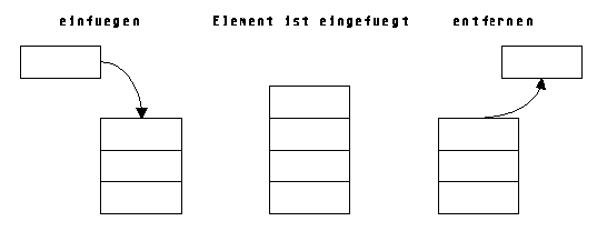 Ein Stack ist ein Last-In First-Out Behälter. D.h. das Element, das als letztes Element in den Stack getan wurde, ist das erste Element, das wieder ausgelesen wird. Anschaulich betrachtet ist der Stack ein Stapel. Jedes Element, das eingefügt wird, wird oben aufgelegt. Wenn ein Element aus dem Stack gelesen wird, wird das oberste Element gelesen. Das Einfügen in den Stack wird auch Push genannt, das Entfernen des obersten Elements Pop.