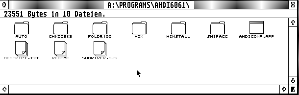 Der AHDI läßt sich auch manuell oder von einer Diskette über den AUTO-Ordner starten. Sinnvollerweise sollte AHDI auf der Festplatte installiert werden, so daß der Atari den Festplattentreiber beim Booten laden kann. Zum Einrichten der Festplatte, also formatieren, partitionieren und Treiber installieren dient das Programm HDX.