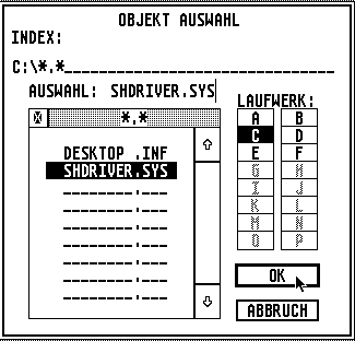Nach dem Start erscheint eine Fileselectorbox, mit der der zu konfigurierende Festplattentreiber ausgewählt werden kann. Hier sollte der shdriver.sys ausgewählt werden, der im vorherigen Schritt auf der Festplatte installiert wurde. | ||||||||||||||