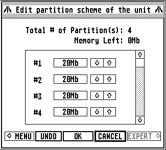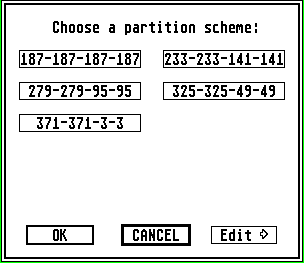 Mit dem Button MENU kommt man auf diesen Dialog. Hier kann man auch aus vorgeschlagenen Partitionsschemata eines auswählen. Der Button Edit führt wieder zu dem obigen Dialog mit der direkten Größangabe der Partitionen. |