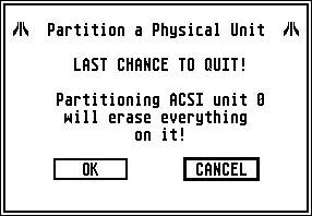 Und zum Schluß wird die Festplatte partitioniert und der Fortschritt in einem Dialog angezeigt. Mit dem Anlegen der Partitionen wird gleichzeitig in der Partition ein FAT Dateisystem angelegt. Wenn die Partitionierung beendet ist und HDX beendet wird, führt HDX ein Reset aus und der Atari bootet. Anschließen kann nach Laden des Festplattentreibers auf die Partition zugegriffen werden. |