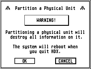 Die Festplatte wird mit dem Menüpunkt Partition partitioniert. Informationen über mögliche Partitionsschema können in der Datei WINCAP vorgegeben werden. Leider unterstützen aber nicht alle Versionen von HDX Partitionsschemata. Die HDX Version 5.00, die dem AHDI 6.061 beiliegt, ignoriert diese Einträge. Die HDX Version 5.01 unterstützt diese Einträge, ignoriert aber die Angabe der Partitionskennung.