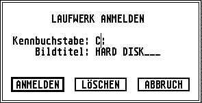 Nun können noch im Desktop Laufwerke für die anderen Partitionen angemeldet werden, Dazu wird ein vorhandenes Laufwerksicon selektiert. Nun kann im Menü EXTRAS der Menüpunkt Laufwerk anmelden... ausgewählt werden. Es erscheint ein Dialog, in dem der Laufwerksbuchstabe und der Text unter dem Icon ausgewählt werden kann. Als Laufwerksbuchstaben für die Festplatten sind der Reihe nach "C", "D", ... zu verwenden. Nach dem Anlegen der Laufwerksicons muß noch mit Arbeit sichern die DESKTOP.INF gesichert werden, damit die Icons auch nach dem Booten wieder erscheinen. |