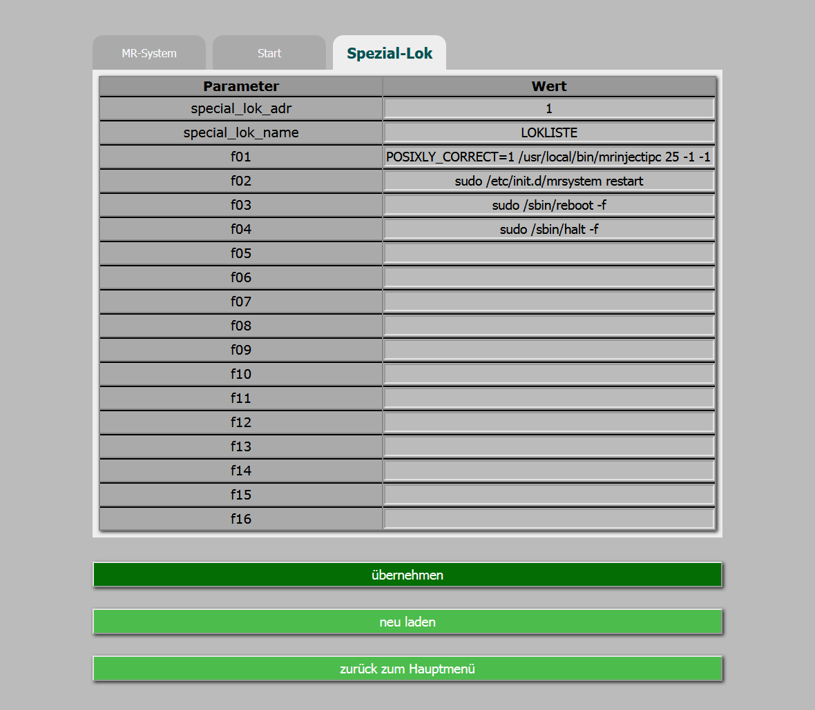 Der Tab Spezial-Lok erlaubt es festzulegen, welche Aktionen ausgeführt werden sollen, wenn eine Funktion einer Lok mit vorgegebener Adresse und Namen ausgeführt werden sollen. Das Formular ist damit ein Editor für die /etc/mrlok Datei. |