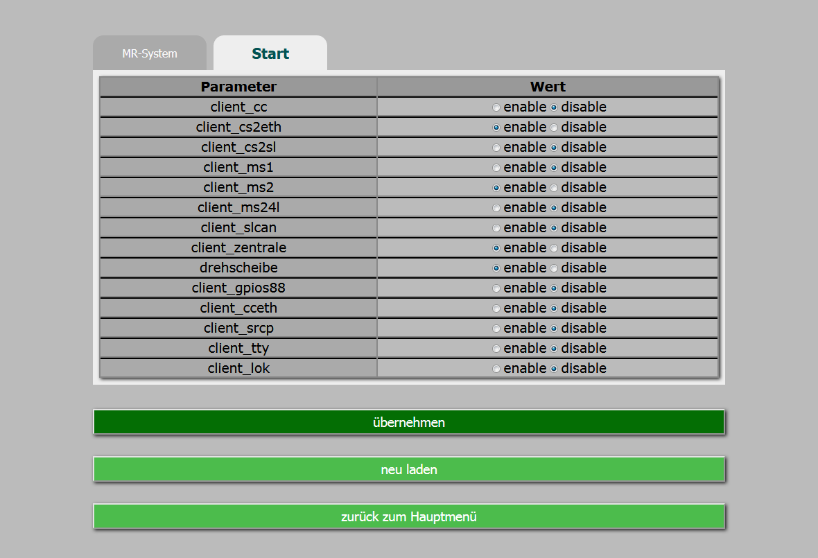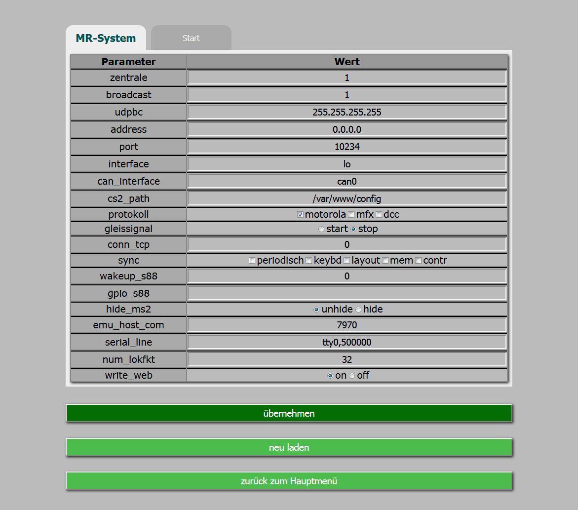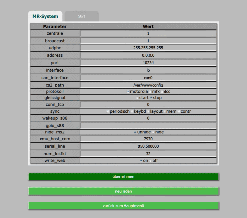 Dieser Tab erlaubt es das Verhalten der Software festzulegen. Das Formular ist damit ein Editor für die /etc/mrsystem Datei. |